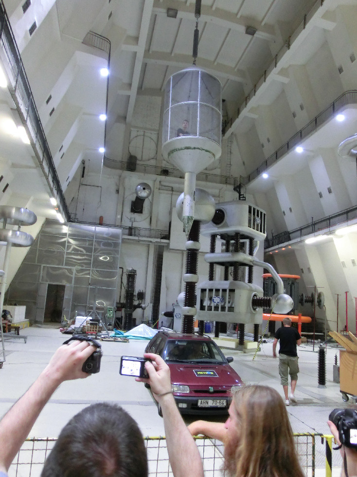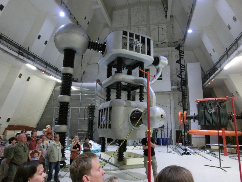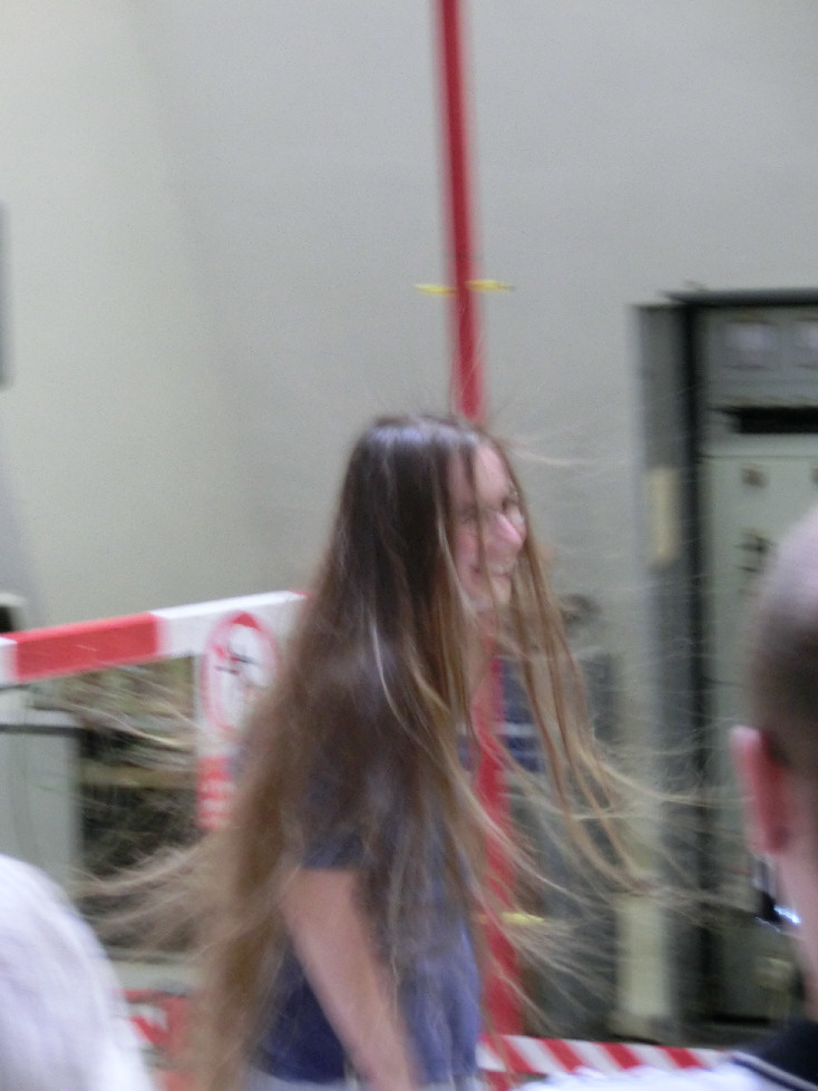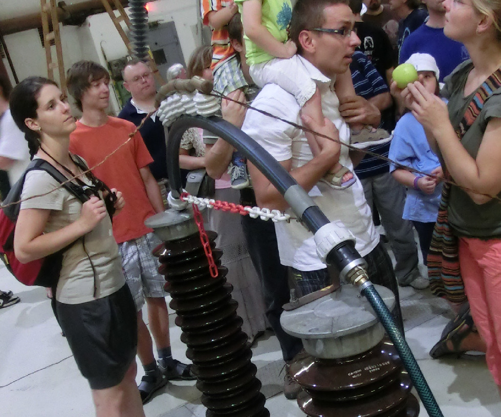 Lidé pod napětím. 70 kV stejnosměrných by mohlo být při troše snahy značně nebezpečné, ale vlasy z toho ještě moc nestojí.