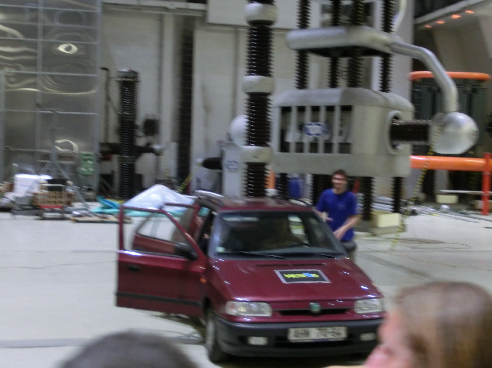 Jaké to asi je, když do auta uhodí blesk? A nebo raději být "nad věcí"? Transformátor v pozadí sice nesimuluje blesk, ale zato se výboj hezky kroutí. Na zničení zapalování těch pár ampérů ale stačilo. Oblouk se zapálil při cca 700 kV.