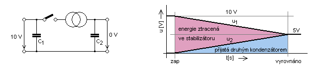 Mějme dva kondenzátory o stejné kapacitě, z nichž jeden je nabit na nějaké napětí a druhý zcela prázdný. Nyní