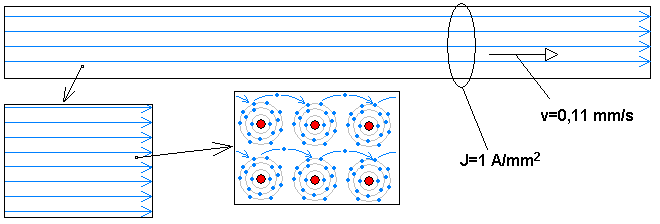 | Nejjednodušší představa elektronů ploužících se vodičem: Poklidně se šourají od atomu k atomu, rychlostí danou proudovou hustotou. |