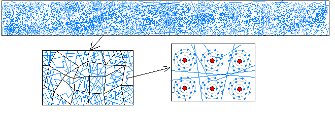Vodič ovšem není homogenní, takže ani tato představa ještě není dokonalá. Kov má mikrokrystalickou strukturu. Při tuhnutí taveniny totiž na mnoha místech začnou růst krystaly, které se posléze v různých vzájemných polohách potkávají a tam to „hapruje“. Také jsou v něm nečistoty a příměsi, které situaci dále komplikují. No a nakonec je tu samotný výrobní proces, který obsahuje dosti násilné mechanické zpracování. Jestliže z úhledného válečku postupným tažením vyrobíme kilometrový drát, z původní struktury toho moc nezbyde.