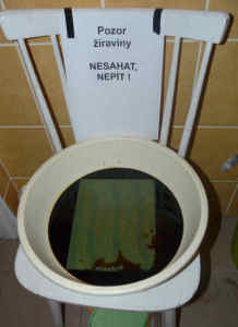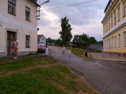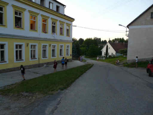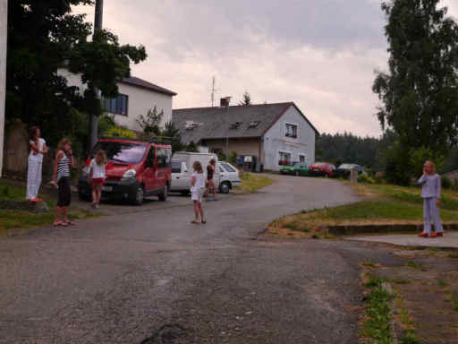 V této budově je jídelna, místnost s elektronikou a modelářská dílna. V horních patrech je ubytován tábor cyklistů. Ti, na rozdíl od nás mají mobily uložené u vedoucích a dostanou je každý den na půl hodiny před večerkou. V tom okamžiku se před dům vyrojí telefonující holčičky, jak je vidět na obrázcích. Takové starosti se nás netýkají, u nás dětem mobily nebereme.
