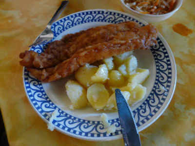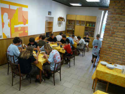 V jídelně se podává jídlo, které vaří zkušené, vesnické kuchařky. Přestože vaří podle stejných norem, jako školní jídelna, výsledek je nejen poživatelný, ale většinou i výborný. Nejprve se nají cyklisté, my přijdeme na řadu o půl hodiny později. To má velkou výhodu: Můžeme si přidávat dle libosti, dokud nesníme úplně všechno. V okolních lesích navíc roste velké množství borůvek, na kterých si lze též pochutnávat.