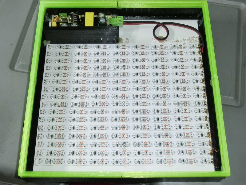 Ale i když si ušetříme práci s výrobou (hlavně vrtáním) DPS, pořád to obnáší zapájet třeba 300 LEDek, tedy 600 nožiček